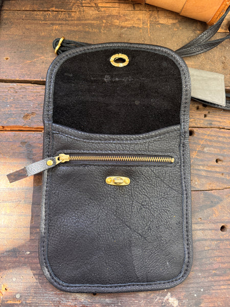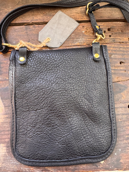 Matching leather strap, 1/2” wide with brass swivels for easy on/off attachment. Fully adjustable with the brass slider from shoulder length to crossbody length.